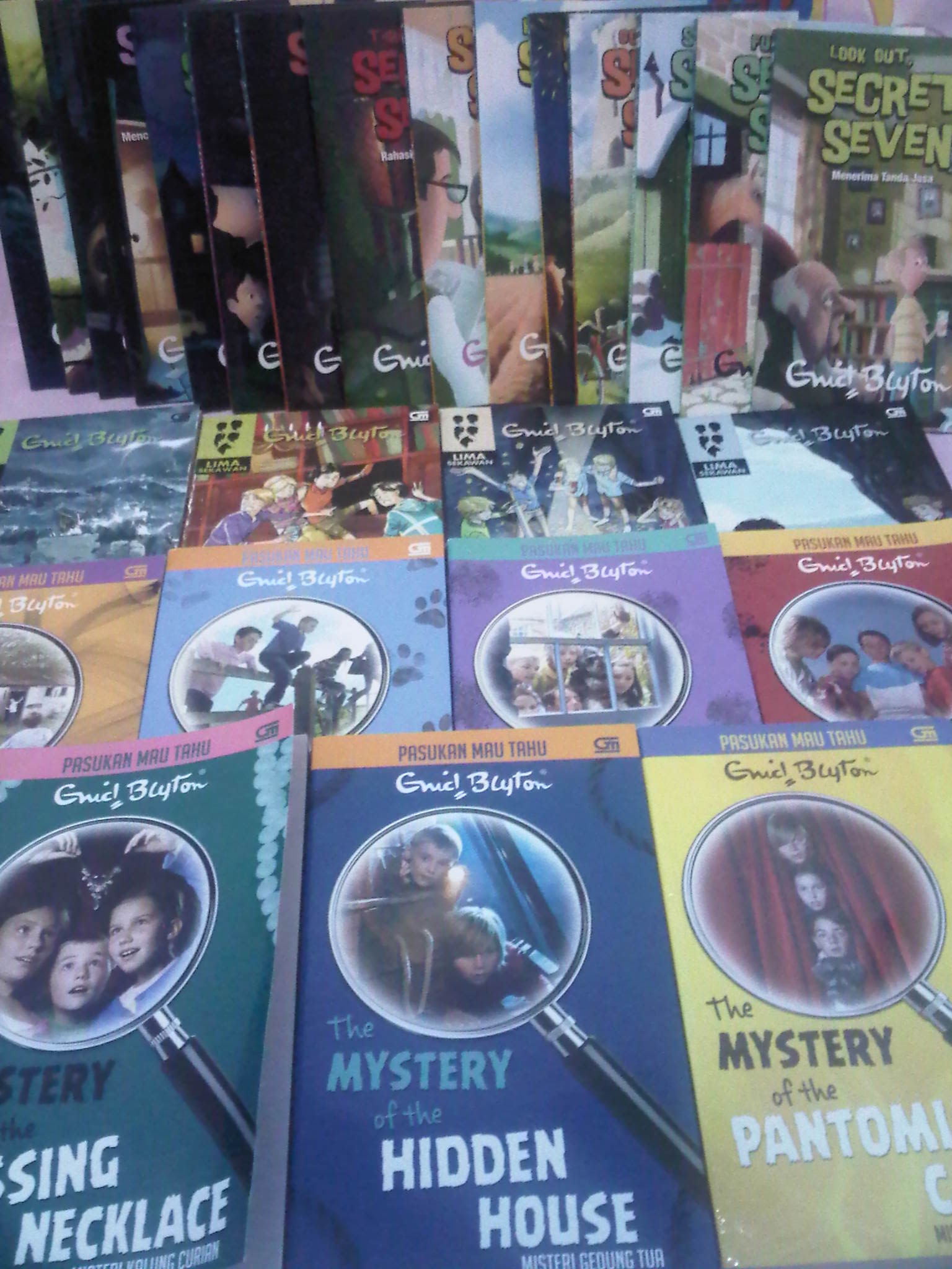 Aku jg suka enid blyton gara2 ibuku pas kecil katanya suka baca. Lima sekawan aku udh 21 buku, secret seven jg udh smua, malory towers sm si badung udh beli online jd ntar udh ada lengkap, st clare baru beli 1. Aku mau beli st clare lg, pasukan mau tahu, sm yg seri petualang.