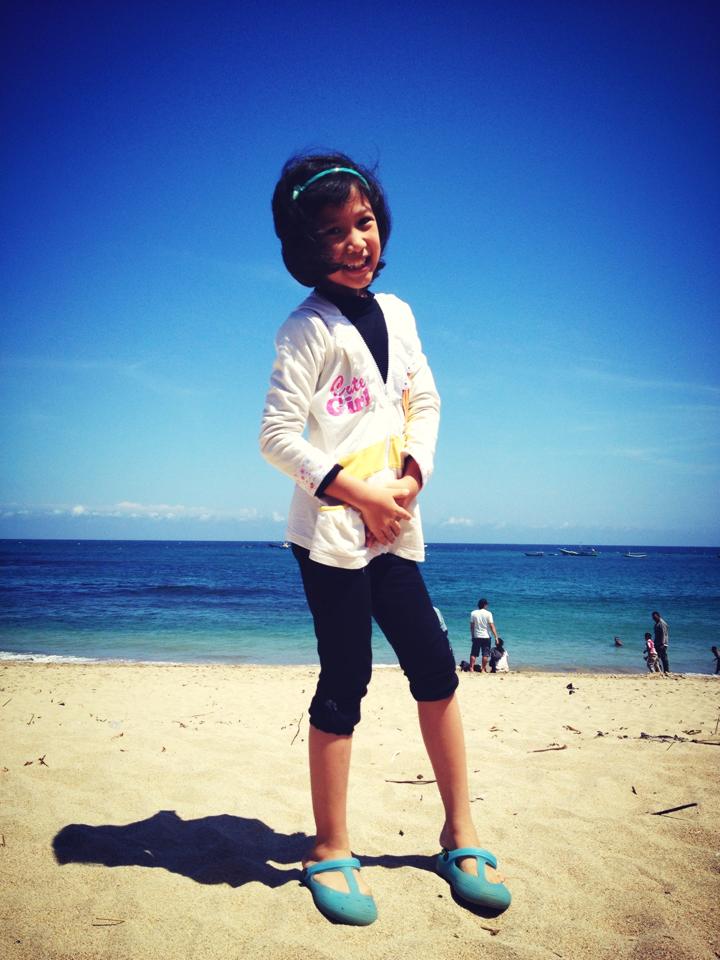 Selain bermain air aku juga bermain pasir pantai dengan membuat benteng di sekitar galian yang aku, mas Dimas, dan mbak Alya buat. Tapi beberapa kali benteng itu hancur terkena ombak. Tapi waktu semuanya bermain air lagi dan aku, mbak Fifi, dan mbak Irma menggali pasir dan membuat benteng di sekeliling galian, benteng itu dapat menahan air yang mau masuk kedalam lubang! Kami bersorak kegirangan karena berhasil membuat benteng yang kuat… ๐