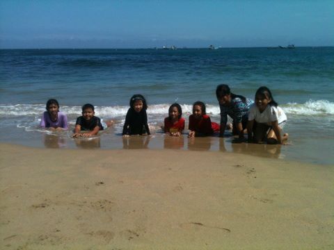 Sesampainya di Pantai Tambakrejo aku berfoto sebentar dulu, baru aku melepas jaketku dan bermain air. Saat bermain air, aku duduk atau tengkurap di pasir yang akan di basahi oleh ombak. Dan saat ombaknya terkena badan rasanya dingiin…! Yang hampir bikin aku takut kehilangan sandalku itu waktu aku bermain air, lalu ada ombak datang dan hampir menghanyutkan sandal milikku dan semua sepupuku yang ikut main air. Untungnya, semua sandal kami bisa diambil kembali sebelum terhanyut ke laut ๐