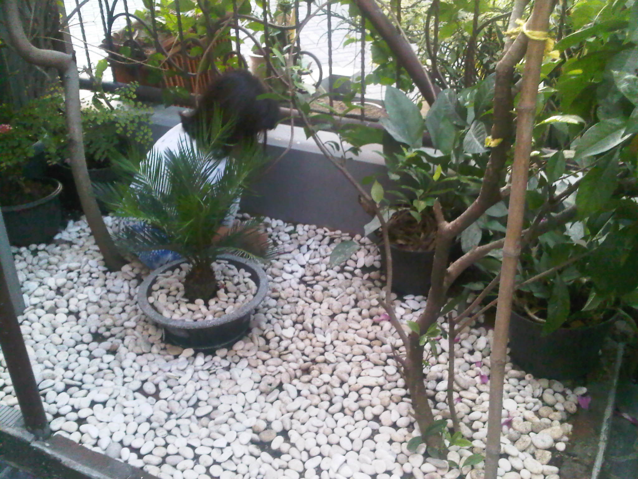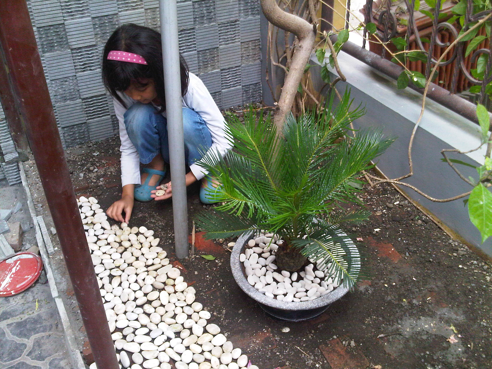 Pertama, yang diperbaiki itu dinding-dindingnya, lalu ditempeli batu alam. Lantainya diganti keramik, baru tanamannya yang beberapa dipangkas dan diganti. Tanamannya yang dipangkas sedikit itu melati, biar rapi. Aku membantu menaruh batu putih dan menyirami tanaman. Saat sudah jadi, aku senang dengan taman depan rumahku yang dulu cukup berantakan dan sekarang bisa jadi bagus begini.