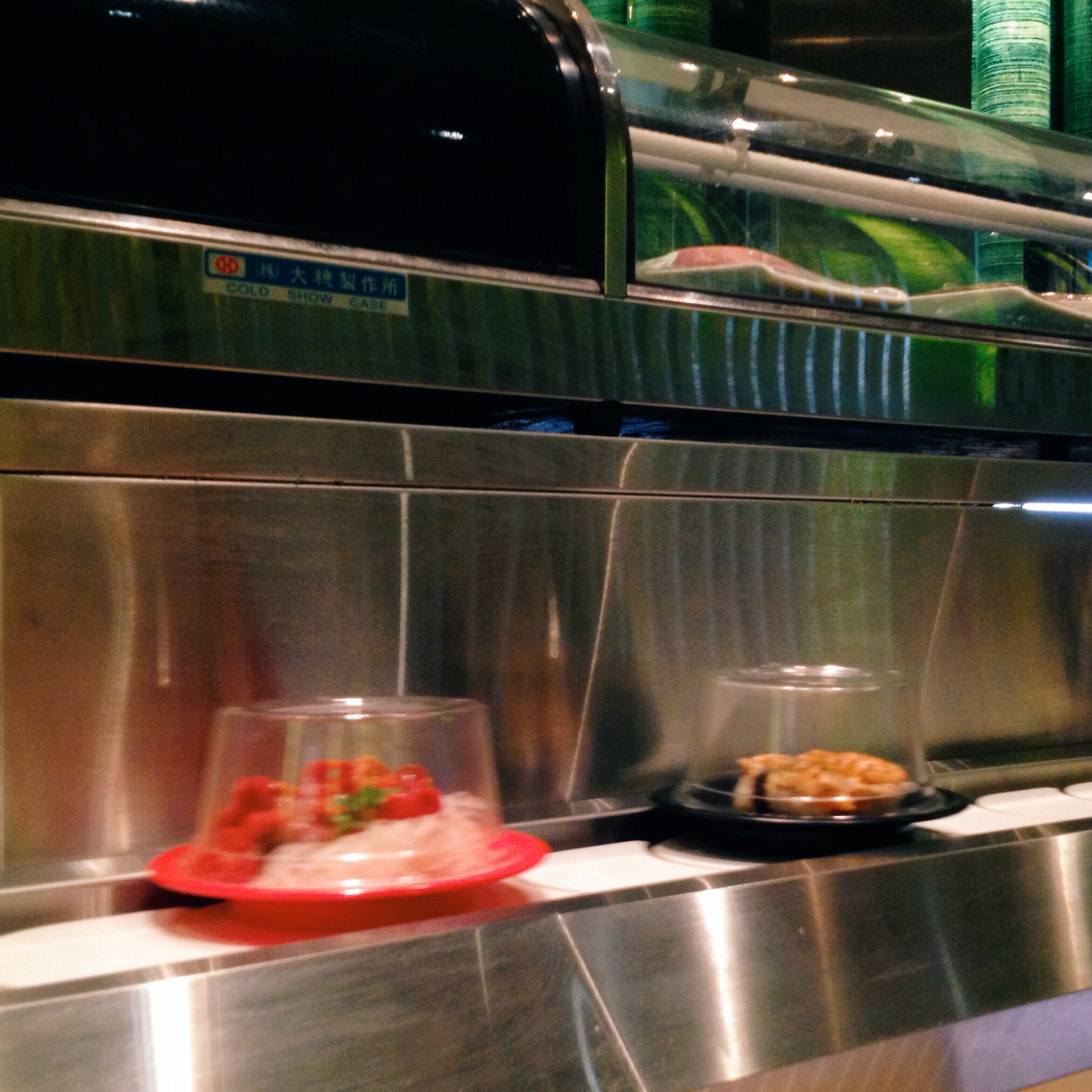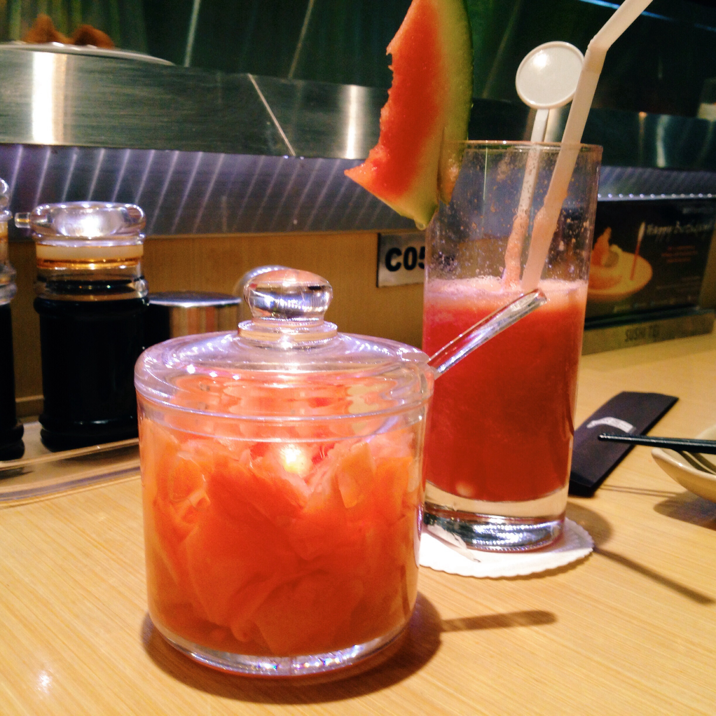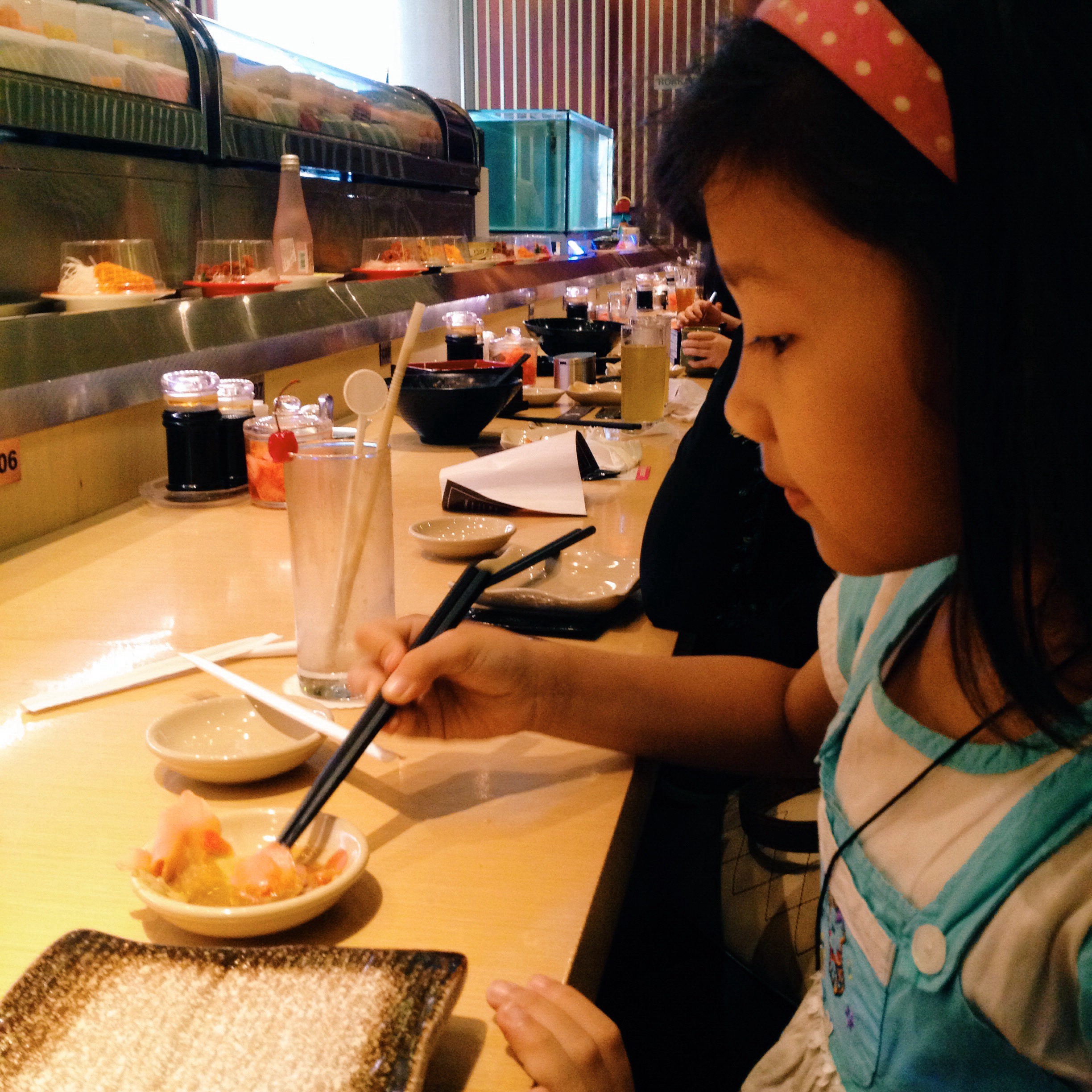 Setelah membeli buku, aku, mamski, dan papski makan di restoran Jepang. Di restorannya ada semacam meja yang ada makanan berputar di atasnya. Jika ada yang tahu namanya, tolong beritahu namanya ya… Soalnya aku belum tahu namanya 😀 Saat sudah memesan makanan tapi makanannya belum jadi, papski mencoba jahe  yang berwarna merah muda. Setelah mencoba, kata papski rasanya manis. jadi aku mencoba jahe itu. Dan ternyata saat aku merasakan jahenyaa… RASANYA ANEH!!!!!.. Anehnya karena terasa seperti rasa asin, pedas, manis, gurih dan agak pahit bercampur di mulutku.