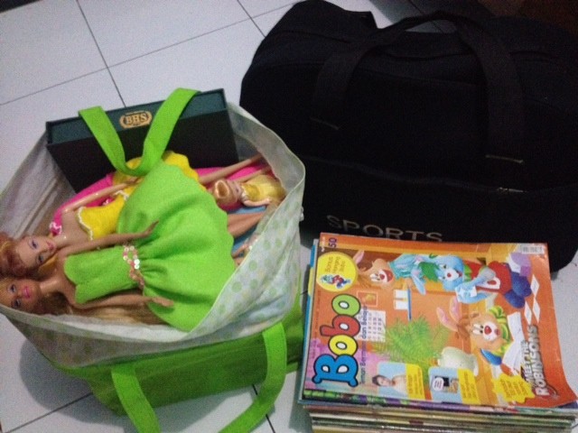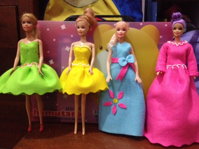 Oya, teman-teman masih ingat kan kalau aku beberapa hari yang lalu membuat baju Barbie? Kalau masih ingat, di bawah ini adalah hasil- hasil baju Barbie yang kubuat. Semua perlengkapan Barbie termasuk baju-baju buatanku dan mbak Su akan kubawa waktu liburan.