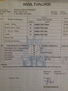 Kemarin, di sekolahku diadakan pengambilan rapot. Yang mengambil adalah wali murid masing-masing. Anak-anak boleh ikut, tetapi kata Bu Guru tidak boleh masuk ke dalam ruangan. Dan lebih baik kalau tidak ikut. Jadi, aku tidak ikut saja. Alhamdulillah, saat membuka rapot di rumah, nilaiku naik. Dulu waktu kelas 1, Jumlah Nilai Prestasi Hasil Belajar-ku 939. Sementara Nilai Rata-Rata-nya 93,9. Kalau yang sekarang, Jumlah Nilai Presasi Hasil Belajar-ku 946. Dan Nilai Rata-Rata-ku 94,6. Jika teman-teman mau lihat nilai-nilainya yang lain, lihat saja foto di bawah ini 🙂