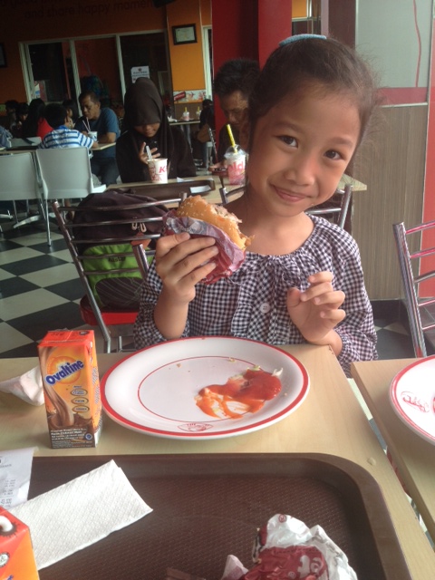 Pertama-tama, sebelum aku les piano, aku diajak ke KFC yang ada di SunCity Mall. Disana aku makan burger dan mamski juga makan burger. Jadi ceritanya hari ini aku ditraktir mamski makan-makan π Dan ceritanya juga aku juga boleh pilih makanan yang aku mau. Yang penting aku tidak alergi.