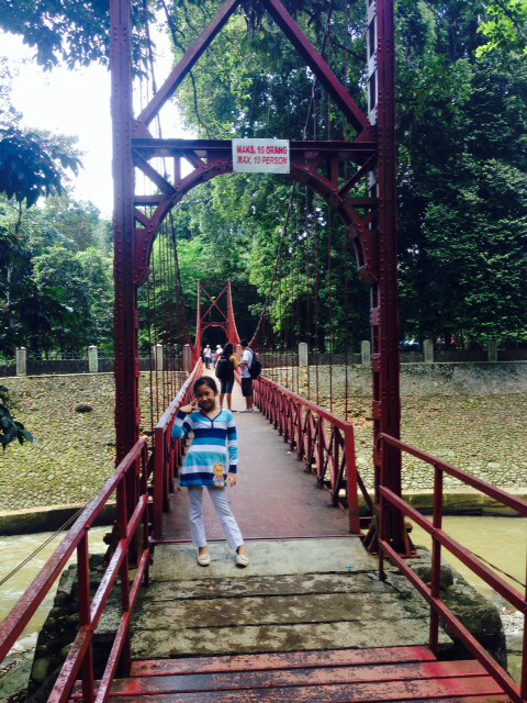 Disana aku foto-foto di depan monumen Kelapa Sawit. Lalu aku naik jembatan gantung yang menurutku mengerikaaan. Soalnya di bawah jembatan gantung itu ada sungainya dan jembatannya bergerak-gerak. Aku juga berfoto di pohon yang sangaaaaat besar.