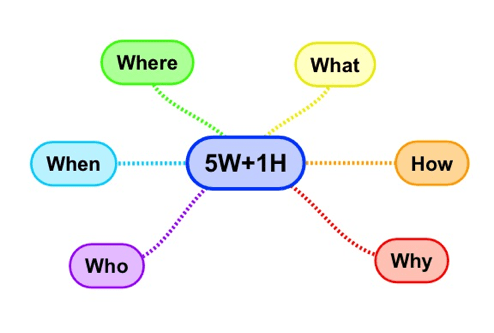 Di presentasi ada Prinsip 5W+1H. Kepanjangannya adalah Who, When, Where, What, How, Why. Prinsip 5W+1H ini artinya itu semacam agar lebih detil untuk bercerita.