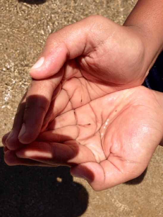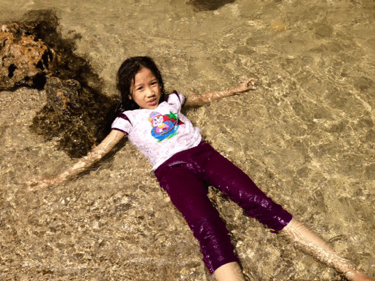 Di pantai Pangi, ombaknya cukup keras, jadinya takut kalau mau berenang di pantai. Untungnya disana ada kolam air payau kalau mau berenang. Air kolamnya jernih. Disana kami sambil mencari kerang-kerang. Tapi sayangnya punyaku ketinggalan, hihihihi… 😀 Gara-garanya kerang punyaku dicampur dengan kepunyaannya Mbak Risma dan kami juga lupa memisah kerang punyaku dan punya Mbak Risma. Sebelum selesai main air dan membilas tubuh, aku sempat berfoto di atas karang raksasa di tepi pantai dan Mas Dimas juga menemukan kecebong-kecebong di balik karang.