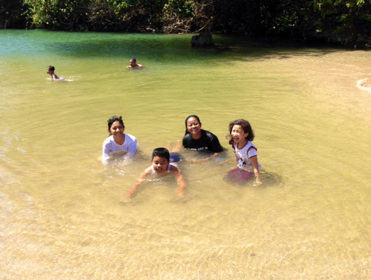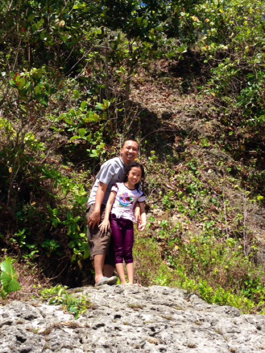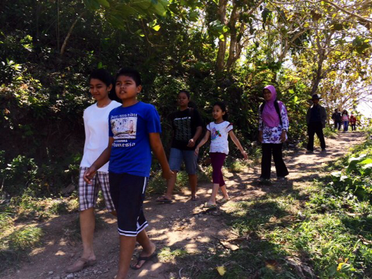 Kami berjalan kaki di jalan setapak yang cukup curam. Beberapa kali aku terpeleset, untung tidak jatuh. Setelah itu kami melewati sungai yang sekarang sudah ada jalannya. Karena kata mamski, waktu mamski kesana dulu belum ada jalannya, jadi harus basah-basahan nyeberang sungai. Setelah melewati sungai, kami jalan lagi sebentar lalu sampai di Pantai Pangii… Horeeeeeee.. 🙂