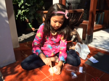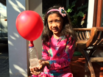 Nah, hari ini aku dan papski mencoba 3 kit eksperimen. Ada yang judulnya Magic Ballon, Lem Ajaib dan Jejak Fosil. Pertama, aku dan papski membuka kit yang judulnya Magic Ballon. Caranya, campur bubuk asam sitrat dan air lalu masukkan kedalam botol bekas. Masukkan baking soda ke dalam balon lalu taruh mulut balon ke mulut botol. Pegang bagian atas balon lalu berdirikan sehingga baking soda-nya akan masuk ke dalam botol. Dan hasilnya, balon itu akan mengembang.. Horeee.. π Jadi eksperimen yang ini menunjukkan tentang adanya perubahan wujud benda dari padat dan cair menjadi gas setelah keduanya dicampur.