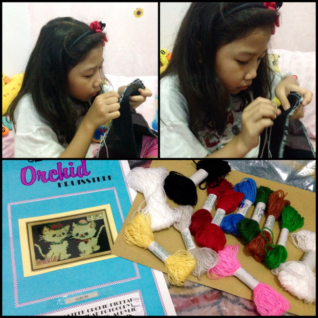 Nah, beberapa hari yang lalu ketika aku pergi ke toko buku, aku menemukan satu set alat kristik. Polanya berbentuk kucing imuuuuut….. Akhirnya, kutunjukkan ke mamski. Aku menunjukkan ke mamski karena setelah mendengar cerita mamski aku ingiiiiin sekali belajar kristik. Lalu aku dibolehkan beli deeeh… Horeeeee……. 🙂