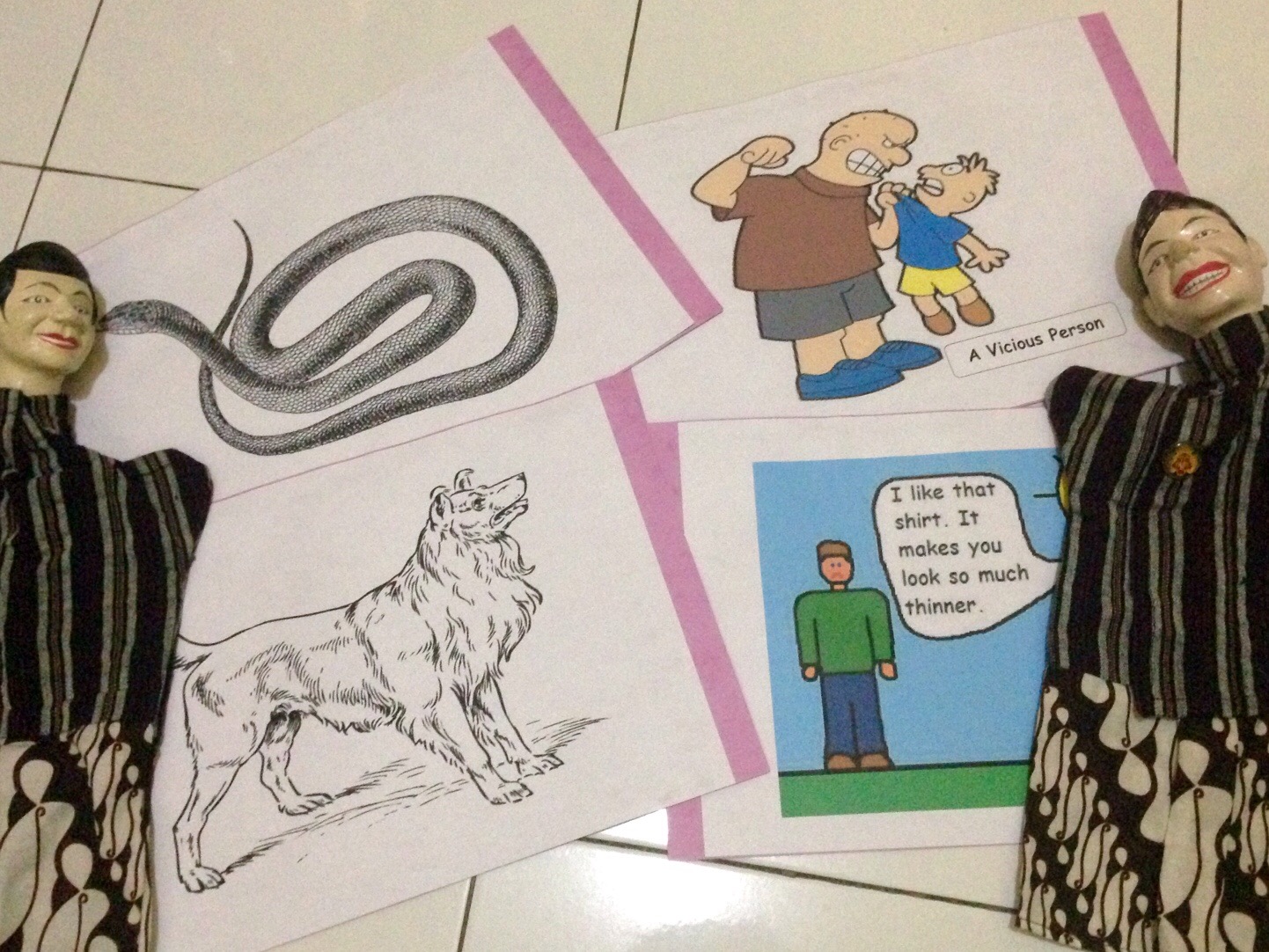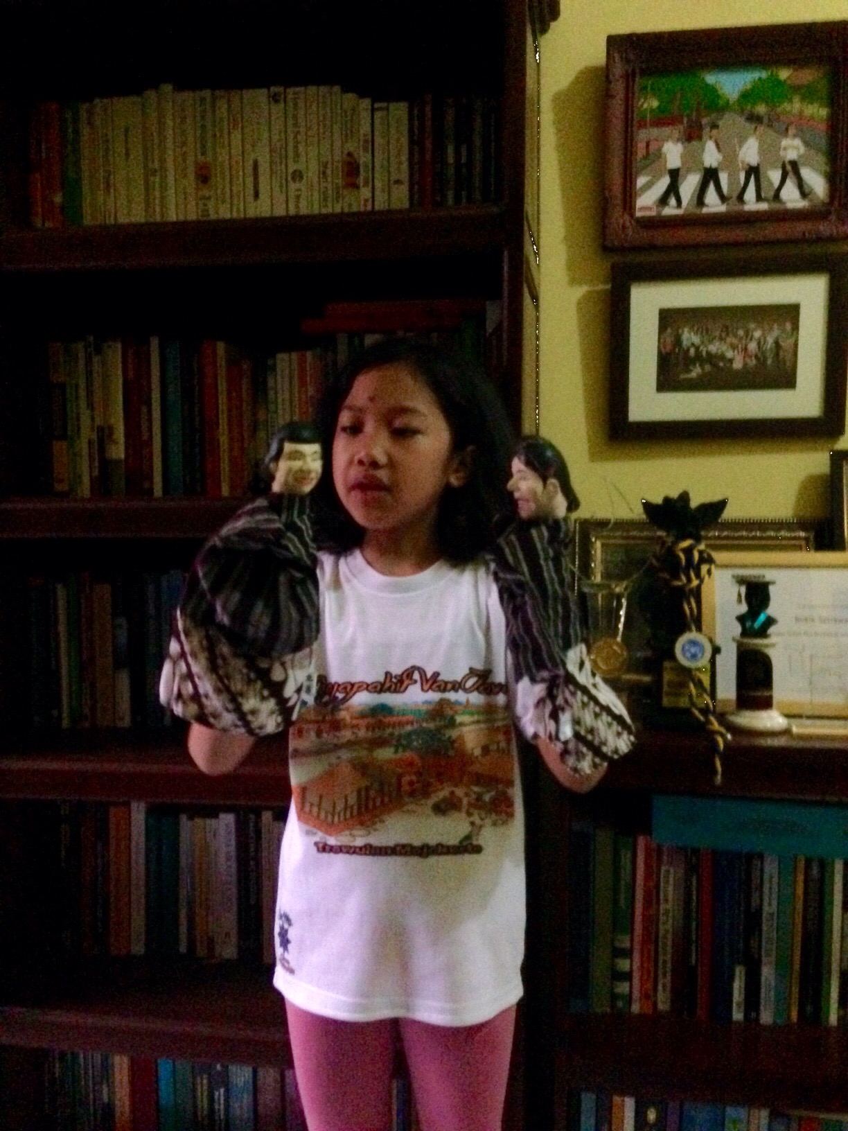 Berbeda dengan aku, Mbak Cantik memilih cerita nomor 3, yang judulnya The Wise Parrot. Nah, saat latihan hari Jumat itu Bu Liz bilang kalau boleh memakai media seperti boneka, dll ketika bercerita. Diberitahu juga kalau lombanya memakai baju bebas. Jadi di rumah, aku dan mamski menyiapkan medianya. Untuk medianya aku ada 2 boneka tangan, dan 4 gambar yang berhubungan dengan cerita.
