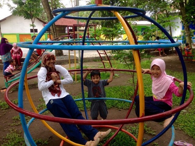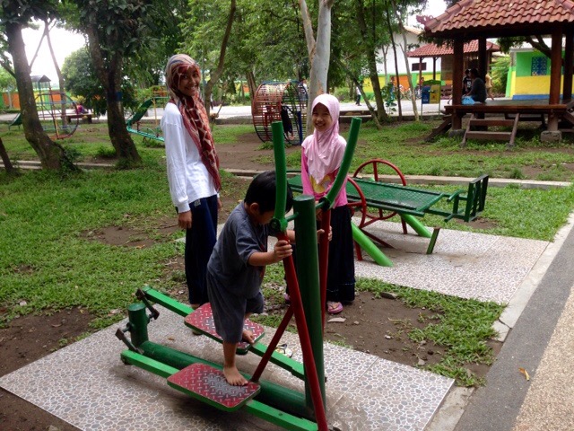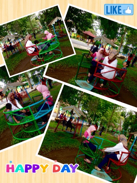 Waktu masuk Taman, aku, Mbak Risma dan Ilham bermain-main di arena permainan yang baru di sebelah kanan. Kami bermain permainan yang dibuat menjadi semacam alat olahraga. Lalu kami juga bermain perusutan, ayunan dll. Baru berfoto-foto di depan air mancurnya.