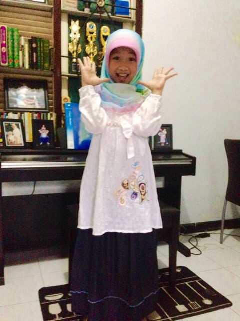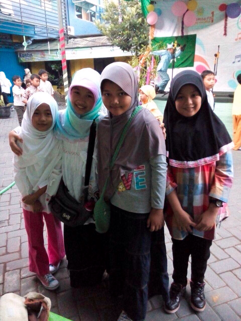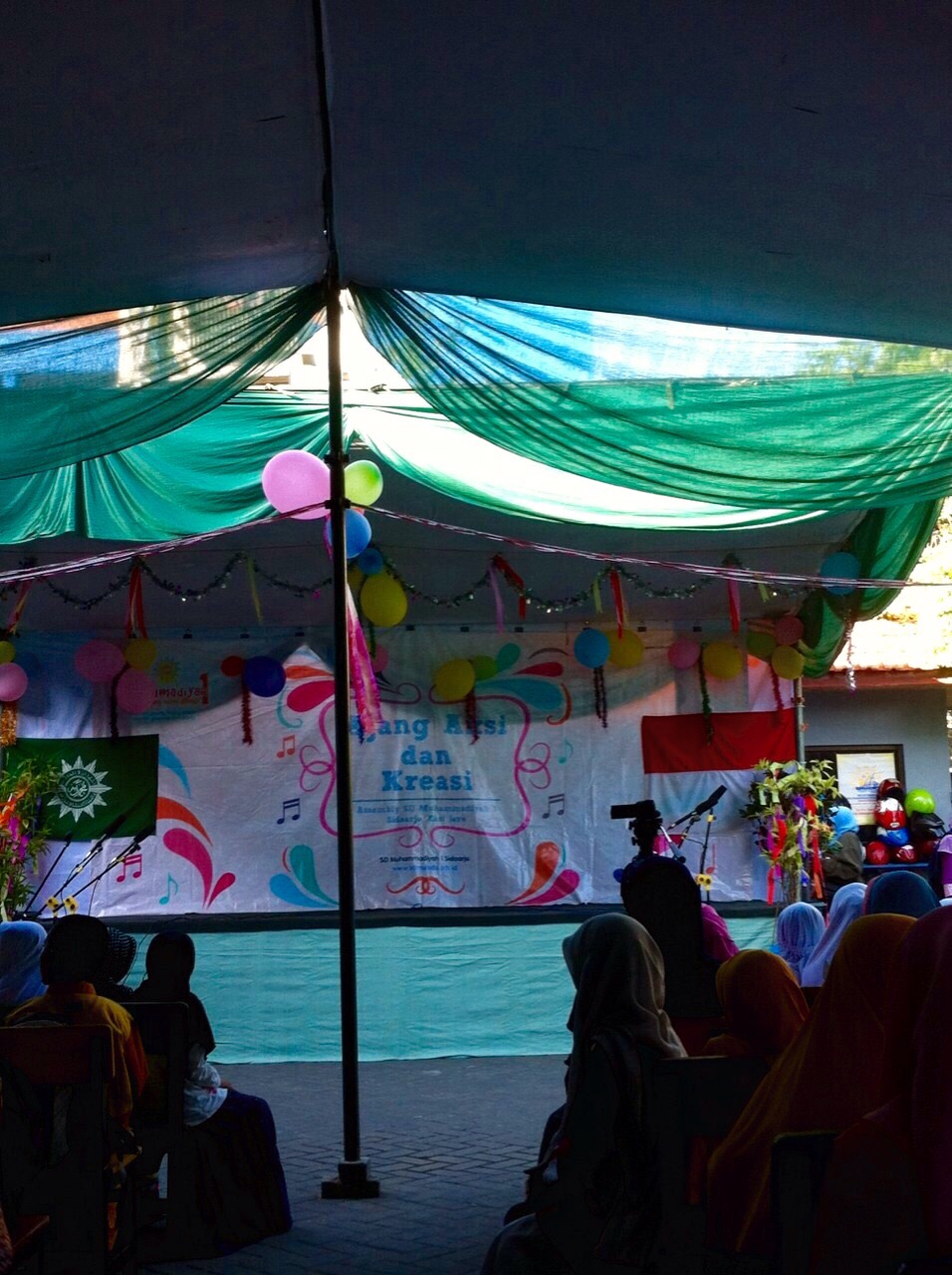 Aku berangkat ke sekolah kira-kira jam 6, diantar sama mamski. Di sekolah sudah ada beberapa anak yang datang, tapi Andi Annisa belum terlihat. Beberapa menit kemudian, Andi Annisa baru terlihat di depan gerbang. Aku dan Andi Annisa segera menuju ke kelasku dan berlatih sebentar. Keadaan halaman sekolah pun semakin ramai. Sebelum naik ke panggung, aku, Andi Annisa dan kedua sahabatku yaitu Ghefira dan Hanum sempat difoto oleh ibunya Hanum. Baru setelah itu, aku menunggu sebentar karena masih belum waktunya untuk naik ke panggung.