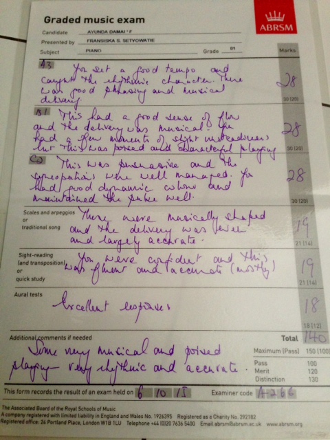 Alhamdulillah, aku mendapat nilai bagus, yaitu 140. Sebenarnya, sebelum aku ujian, guru pianoku sudah bilang kalau 100 itu nilai lulus, di atas 120 itu Merit atau diatas rata-rata, di atas 130 itu Distinction yaitu kategori tertinggi kelulusan ujian ABRSM. Aku termasuk nilai Distinction. Saat guru mengabari hal itu ke mamski, mamski langsung teriak senang. Aku juga ikut teriak-teriak karena tidak menyangka kalau nilaiku bisa setinggi itu 😀