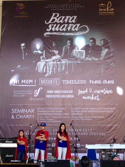 Seperti yang sudah kuceritakan di tulisan sebelum ini, hari ini (Minggu) aku ada acara di Bazar Musik Psychofest di SUTOS (Surabaya Town Square). Bazar Musik Psycofest adalah satu acara pentas musik yang diadakan oleh mahasiswa Fakultas Psikologi Universitas Airlangga. Kebetulan di Bazar Musik ini, sekolah musikku diundang untuk mengisi acaranya. Dari Sforzando, yang mengisi acara adalah beberapa murid reguler dan murid-murid berkebutuhan khusus, serta salah satu guru yang ikut dalam rangkaian Talkshow.