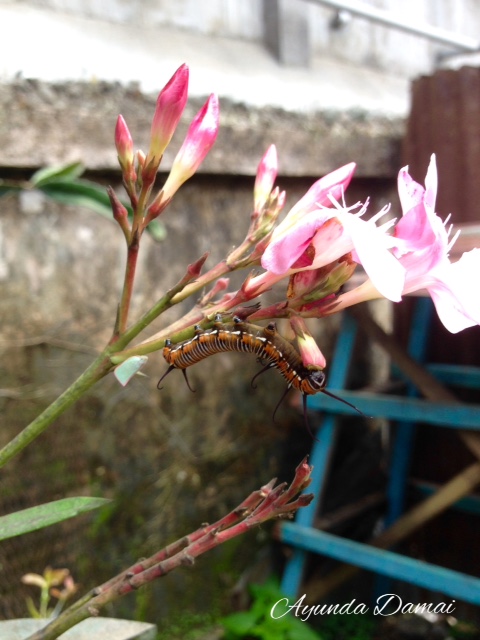 Sementara, kejadian yang membuat cukup kaget adalah saat mamski mancoba menyibakkan bunga di bawah ini. Tadinya maksud mamski adakah untuk membersihkan bagian bunga yang sudah kering. Tapi ternyata di balik bunga itu terdapat ulat yang cukup besar yang mungkin sedang makan kuncup salah satu bunga tersebut. Dan itu membuat aku agak takut-takut memotretnya 😁
