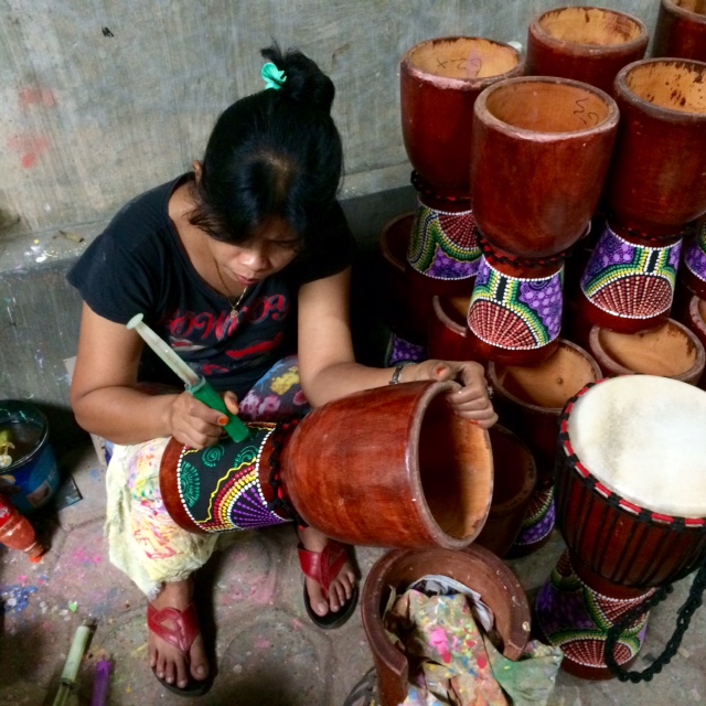 Ketika sedang putar-putar mencari Pusat Kerajinan Batok Kelapa, kami justru menemukan Kampung Wisata Kendang Sentul. Walaupun tidak di tempat tujuan, kami semua tidak kecewa. Karena tempat itu juga salah satu tempat wisata kerajinan yang menjadi pilihan tujuan kami walaupun bukan yang utama. Warga di kampung ini memproduksi aneka kerajinan kayu, utamanya Jimbe. Jimbe itu alat musik pukul yang seperti kendang, bentuknya seperti yang ada di foto atas inj. Tapi tidak hanya jimbe atau kendang sentul saja yang dibuat. Ada juga berbagai alat musik lain seperti xylophone kecil, marakas, mainan anak, alat terapi, alat pemijat, dll.