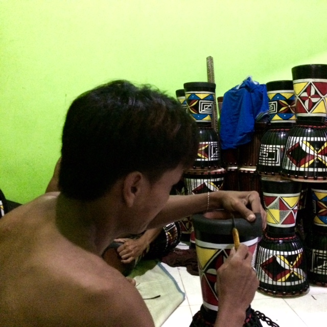 Saat itu, kami mengunjungi 2 rumah yang masing-masing ada tokonya. Kami mengunjungi 2 toko karena di toko yang pertama, kendang sentulnya tidak jelas harganya dan pilihannya juga terbatas. Jadi kami menuju toko kedua yang letaknya agak ke dalam, namanya Surya Aji. Di toko ini pilihannya jauh lebih banyak dari toko yang pertama. Dan aku agak kaget karena toko ini mengekspor barang-barang mereka sampai ke Korea!!! Tapi memang di Korea terdapat tarian tradisional yang menggunakan Jimbe.