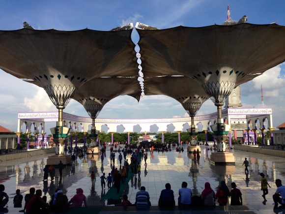 Setelah membeli-beli oleh-oleh, aku, mamski, dan papskipun masuk untuk shalat, dan berfoto di halaman masjid. Di MAJT (Masjid Agung Jawa Tengah), aku dan mamski sempat kebingungan juga saat mencari tempat wudhu. Ternyata, tempat wudhunya itu ada di lantai bawah. Lalu naik ke atas lagi untuk shalatnya.