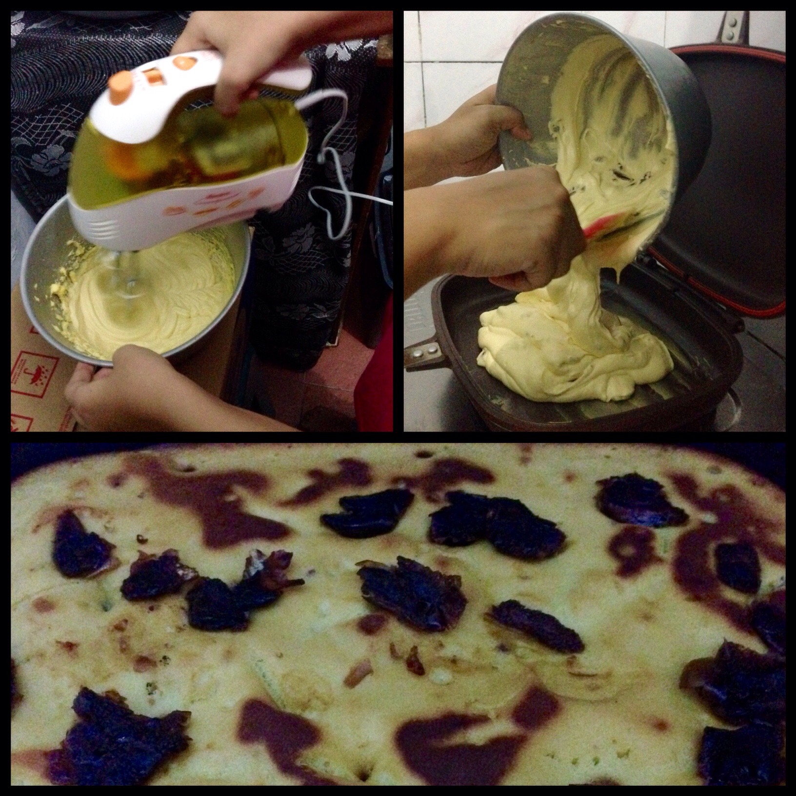• Masukkan baking powder dan sisa tepung terigu bergantian dengan santan sambil dikocok rata.
