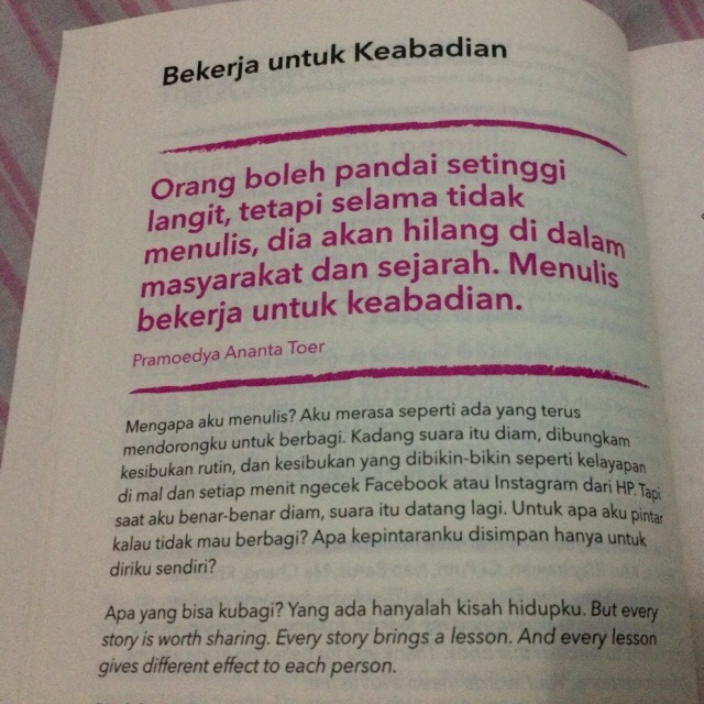 Damai.. Tulisan kamu bagus bgt.. Ini pertama kali saya baca tulisanmu.. Quotes ttg menulis td bnr2 mengena, betul bgt, totally agree.. Trus kmu jg lucu jg ya, pas kmu crita ttg si perek itu.. Di Indonesia pasti hmpr gada kya si perek itu.. Apalagi tdr sambil pake baju seragam, klo plg sekolah lgsg tdr pake seragam mgkn bnyk di Indonesia tp klo mau brgkt sekolah?? Hehe.. Hampir dipastikan gada.. Hehe.. Ada lg g ya buku itu, mau jg pny utk dibaca sama anak saya nanti klo udah agak gedean..