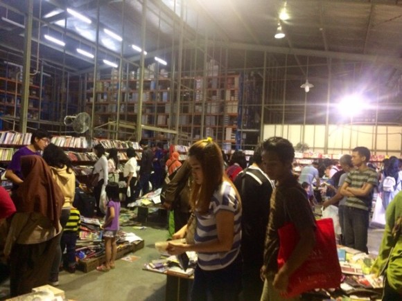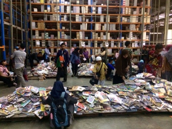 Oiya, satu hal lagi yang perlu diperhatikan adalah, untuk satu putara kunjungan, setiap pengunjung hanya mempunyai waktu 1 jam untuk mencari buku. Jika 1 jam itu sudah selesai, kalian harus keluar gudang dulu dan membayar di kasir. Namun kalau kalian masih mau belanja buku dan mencari buku menarik lainnya, setelah membayar dulu buku-buku yang kalian dapatkan sebelumnya, kalian bisa masuk lagi ikut rombongan sesi berikutnya. Jeda waktu antar sesi/putaran adalah 15 menit. Selama 15 menit itu, pegawai-pegawai yang ada di dalam gudang akan merestok isi buku di gudang supaya tidak terus-terusan habis. Tapi kalau aku sendiri kemarin langsung pulang karena merasa buku yang kubeli sudah cukup. Aku dan mamski membeli 18 buku dengan total harga hanya 90 ribu rupiah saja.